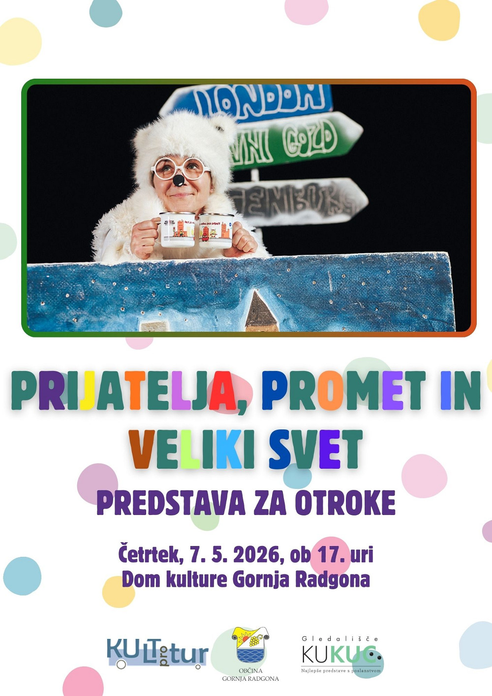 Das Stück entstand in Zusammenarbeit mit der slowenischen Behörde für Verkehrssicherheit und ist für Kinder von 3 bis 9 Jahren geeignet. Es wird am Donnerstag, dem 7. Mai 2026, um 17:00 Uhr im Kulturzentrum Gornja Radgona aufgeführt. Die Aufführung findet am KU-KUC Theater statt. Eine Einzelkarte kostet 3 €, ein Abonnement (7 Vorstellungen) 18 €. Karten sind in der Touristinformation oder eine Stunde vor Vorstellungsbeginn erhältlich.