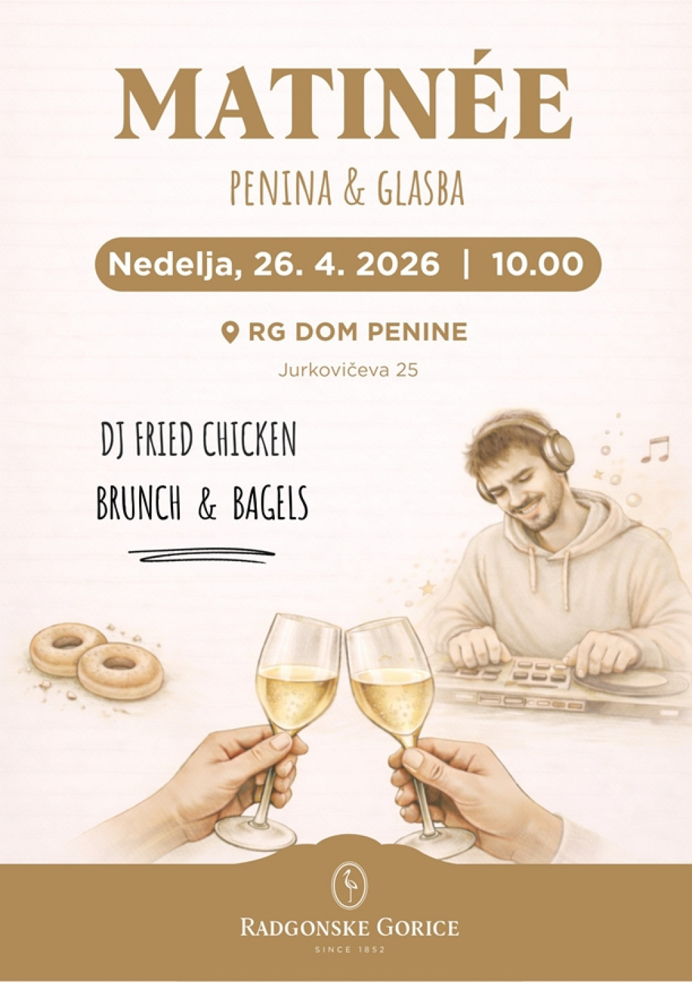 Dogajanje dopolnjuje brunch ponudba z bagli in izbranimi jedmi, ki poskrbi za popolno ravnovesje med okusi in razpoloženjem.
