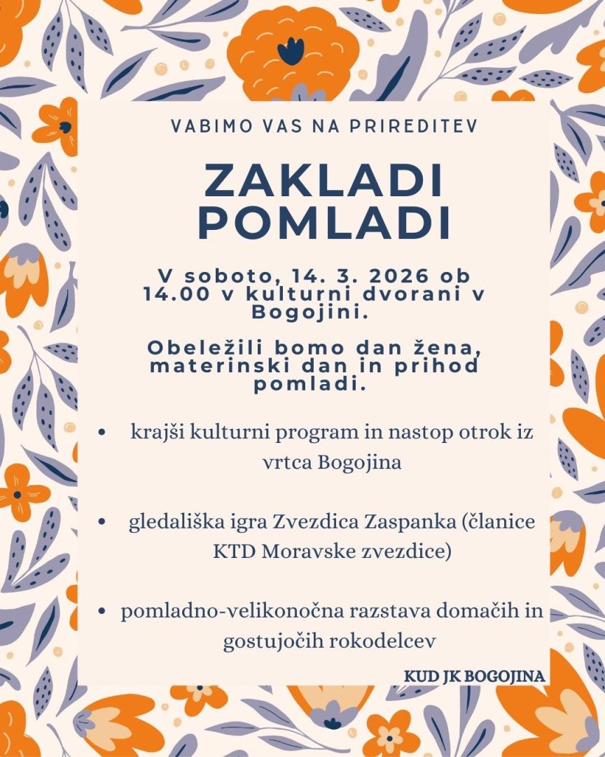 Dogodek bo obogaten z gledališko predstavo, folklornim nastopom ter nastopom otrok iz Vrtca Bogojina, ob tem pa bomo slovesno odprli tudi velikonočno razstavo, ki si jo bo mogoče ogledati še naslednji dan.