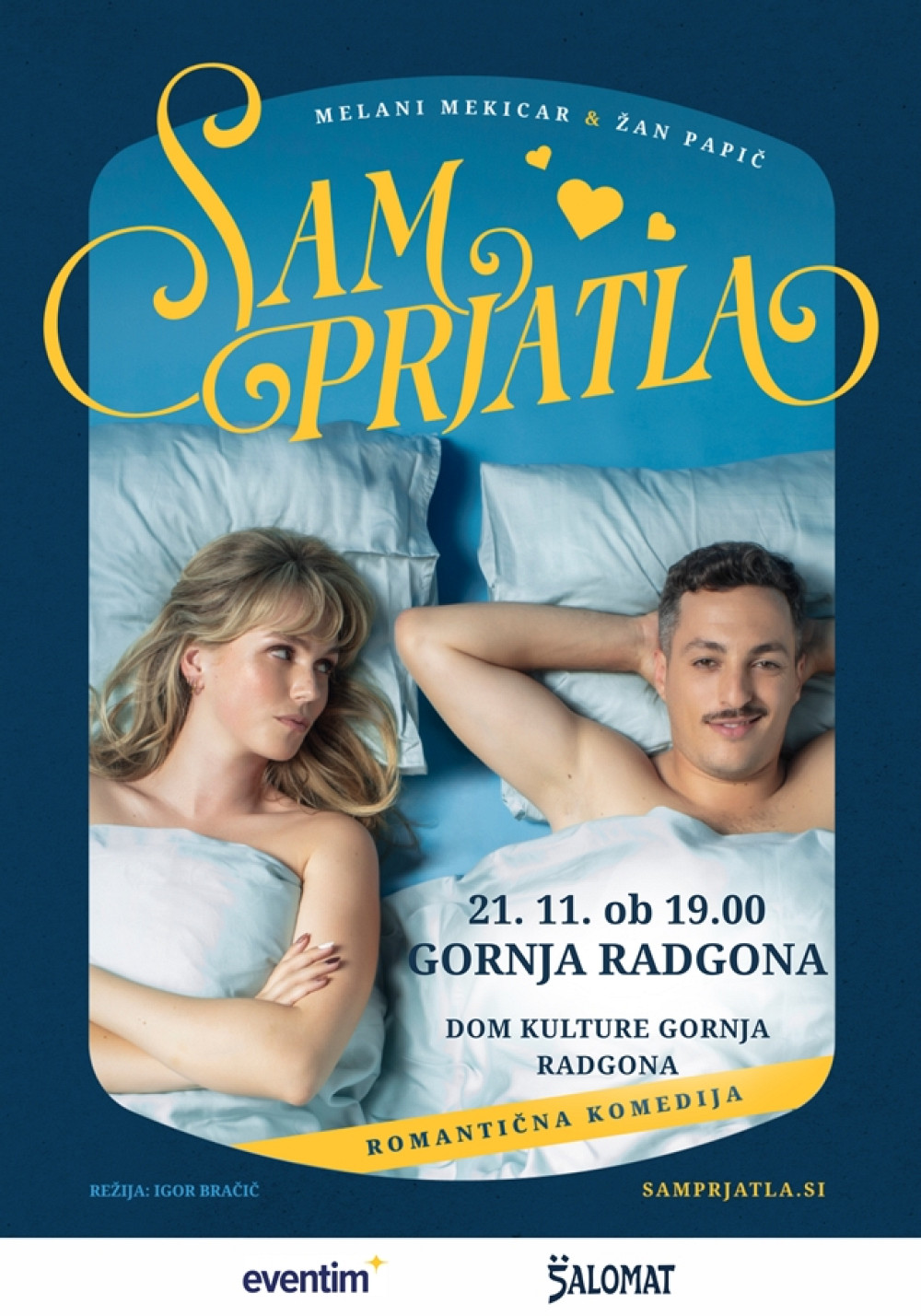 A Sam prjatla című romantikus vígjáték Žan Papič és Melani Mekicar főszereplésével 2025. november 21-én, pénteken 19 órakor lesz látható a Gornja Radgona Kulturális Központban.