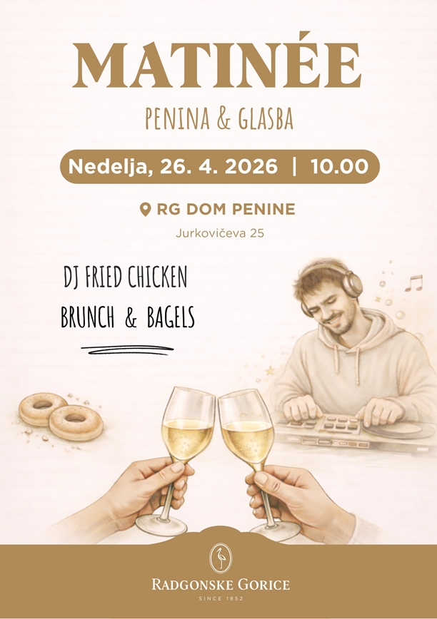 Vabljeni na sproščeno nedeljsko druženje v Domu penine, kjer se prepletajo penina, glasba, kulinarika in prijetno vzdušje. MATINÉE prinaša celodnevno doživetje – od dopoldanskega bruncha do popoldanskega uživanja ob kozarcu penine in ritmih glasbe.