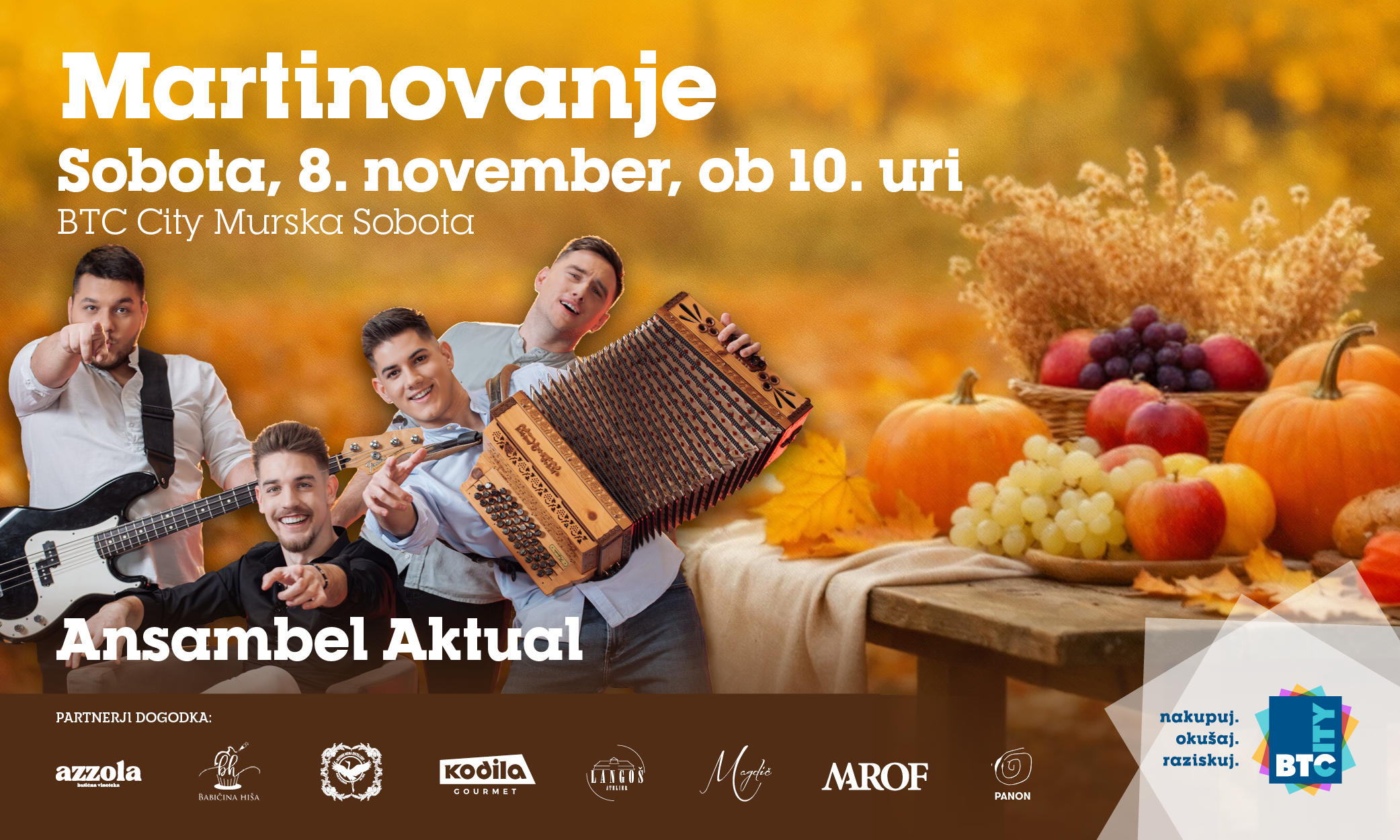This year, St. Martin's Day in Murska Sobota will take place at BTC City Murska Sobota. There, on Saturday, November 8, 2025, between 10 am and 1 pm, you can expect culinary delights, stalls, entertainment with the Aktual ensemble, the baptism of must, and a visit from the wine queen.